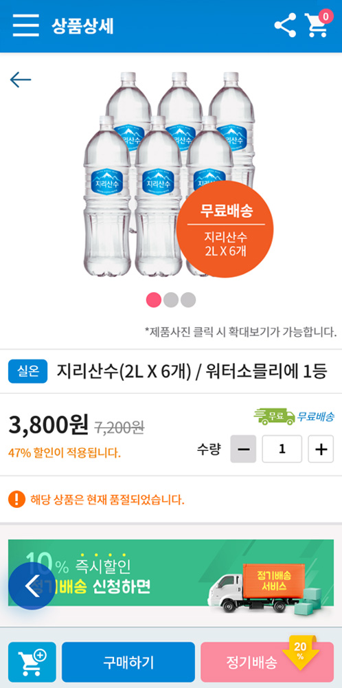 아워홈의 대표 브랜드인 지리산수의 심볼컬러인 블루컬러로 제품에 대한 신뢰감, 투명성을 제공하여 브랜드 가치를 제고하였습니다. 이와 함께 제품컬러로 활용되고 있는 핑크컬러를 포인트 컬러로 선정하여 순수함과 부드러움을 표현했습니다. 기능적인 측면에서는 정기배송 기능을 추가하여 트렌드에 부합하는 배송 시스템의 체계를 확립했습니다.